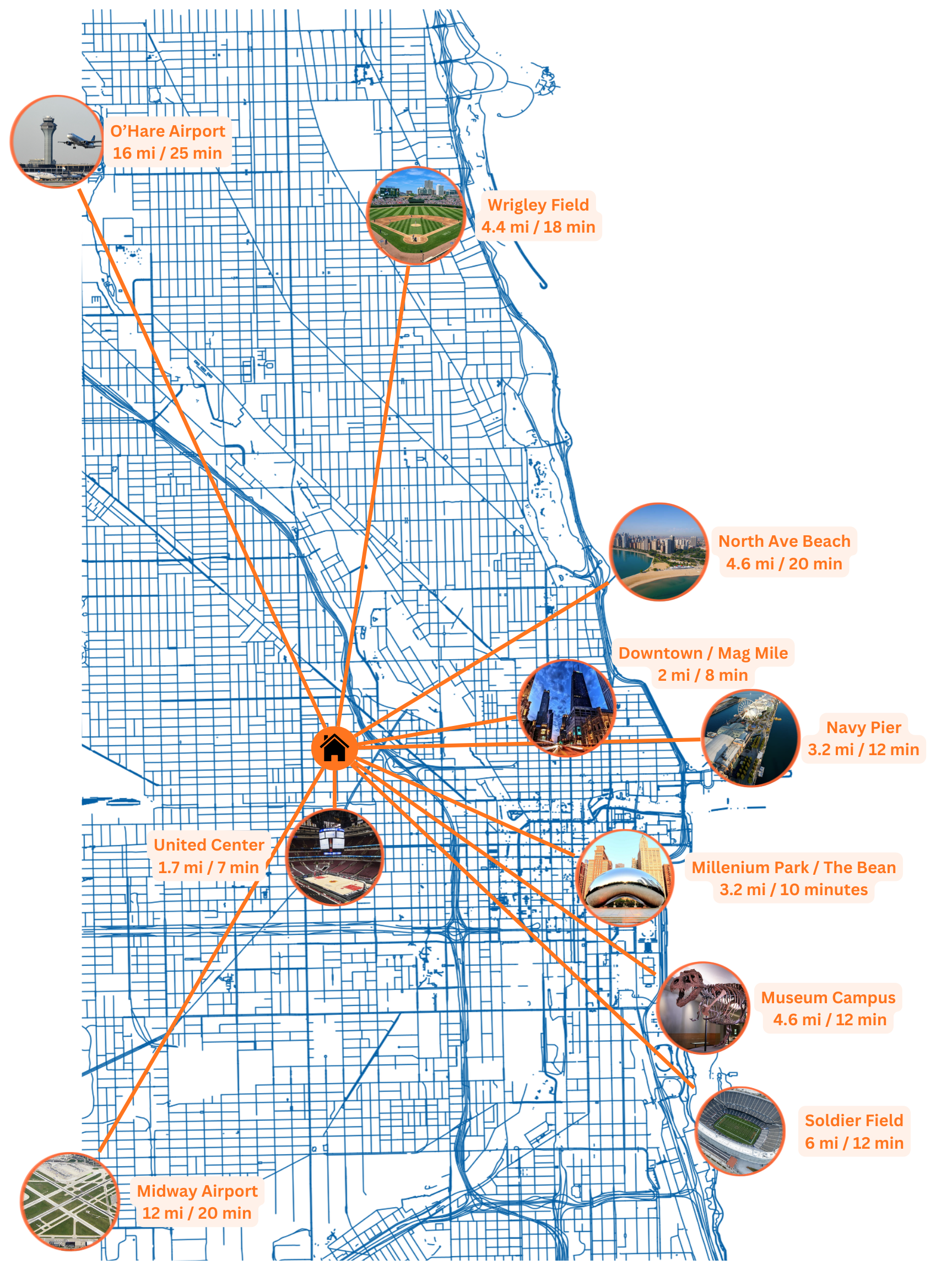 You can easily park on the street, it is a residential permit zone and we will provide you with daily permit stickers on request (free of charge). It's an 8 to 10 minute walk to the blue line CTA (the L) station which will have you in the loop (downtown center / 2 stops to Clark/Lake) in less than 5 minutes or at O'Hare airport in about 38 minutes. Trains leave every 5 to 8 minutes. Arriving by train just walk west on Chicago Ave leaving the skyline behind you, then turn right on Bishop St and left on Fry St. From the condo It's a 3 min walk to the nearest Divvy bike station where you can rent bikes or E-Scooters with the Lyft or Divvy app. Chicago has a lot of bike lanes! For those who enjoy a nice walk, it's about 35minutes to River North with all the fine dining and shopping opportunities. It's about 45 minutes to walk to the Mag Mile (Michigan Ave).