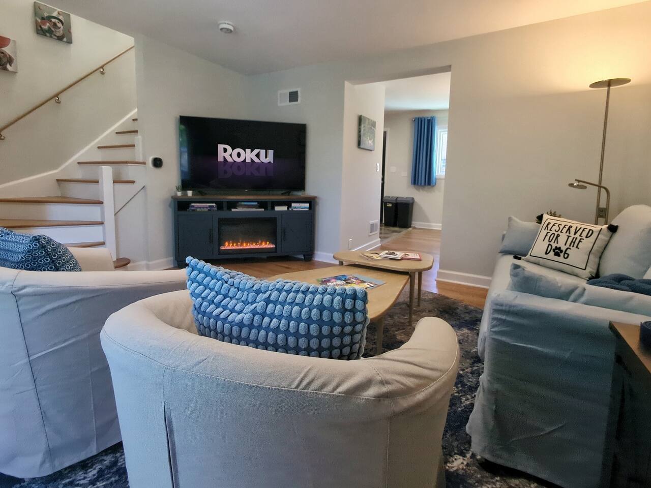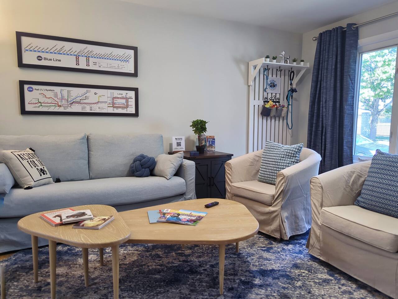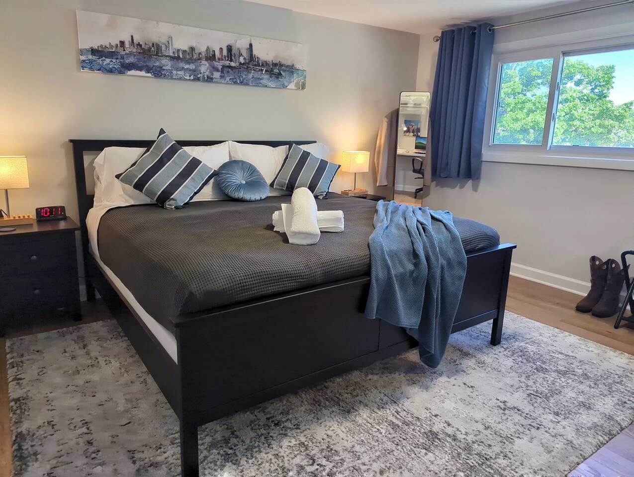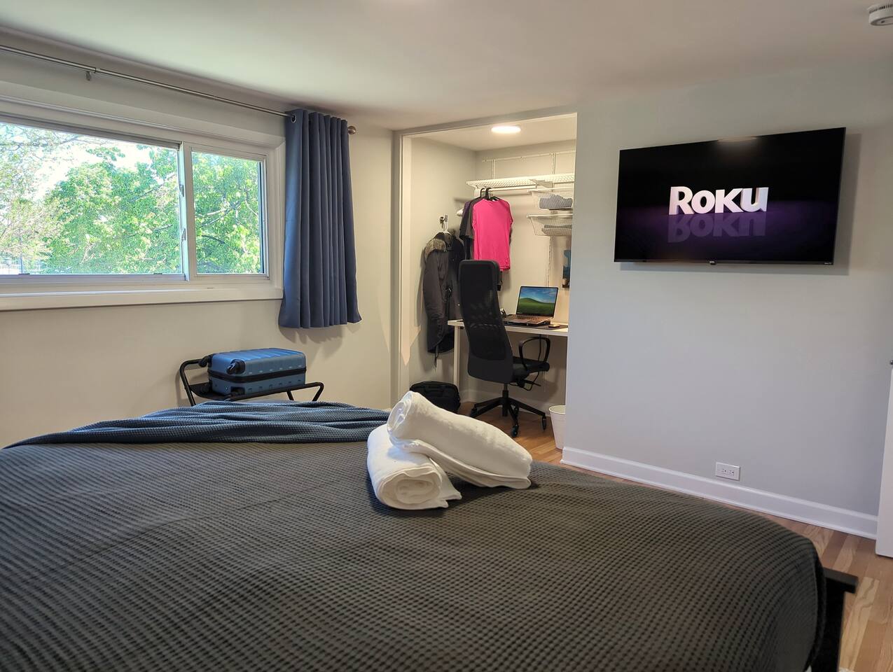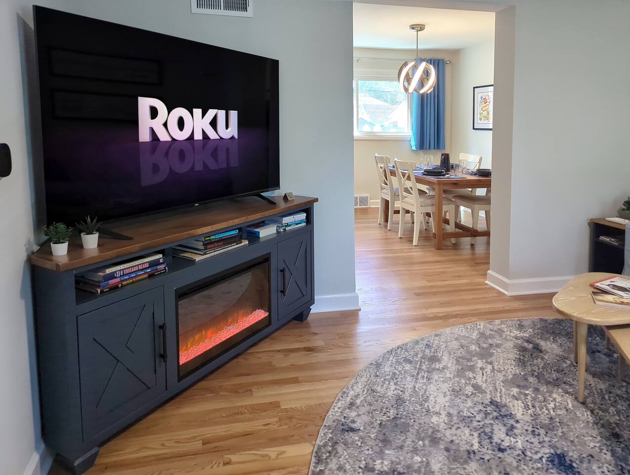 Step into a fully remodeled haven where everything is new—yes, even the light switches are living their best lives. This two-story charmer blends modern comfort with just the right dose of personality. Downstairs, you’ll find a bright, open-concept living room featuring a large Roku smart TV (bring your logins!), an electric fireplace, a dining area for four, and a well stocked kitchen. Coffee lovers rejoice: there’s a bean-grinding coffee machine ready to caffeinate your mornings, and tea drinkers, we see you too—there’s a selection waiting for you. Upstairs, two stylish bedrooms await. The master has a dedicated workspace, perfect for pretending to work while streaming your favorite shows on the smart TV (just saying). The second bedroom also boasts a large smart TV, because equal binge-watching rights for all. Both bedrooms feature soft and plush bamboo linens. The shared bathroom features a walk-in shower and has all soaps, lotion etc. you need. Central AC and heating keep things comfy no matter the season. Need entertainment? Bust out the board games and challenge your travel companions to an epic showdown (Monopoly friendships will be tested). One parking spot in the rear parking lot is all yours, and additional free street parking is available. Oh - and did we mention it’s dog-friendly? Your furry friend gets the VIP treatment too, complete with dog dishes, toys, and a doggy door that leads to a small fenced yard - perfect for sniff-inspecting the perimeter. And a word about the location: Just steps from your front door, you'll find a park, pool, tennis courts, and the Roos Recreation Center. Stroll just 5 minutes to the Harlem Blue Line Station and you’re in downtown Chicago (35 min) or at O'Hare airport (80 min) without having to switch to busses or other trains. For our four-legged friends several dog parks are just a tail-wag away. Whether you’re here for business, fun, or a bit of both, this location nails it.