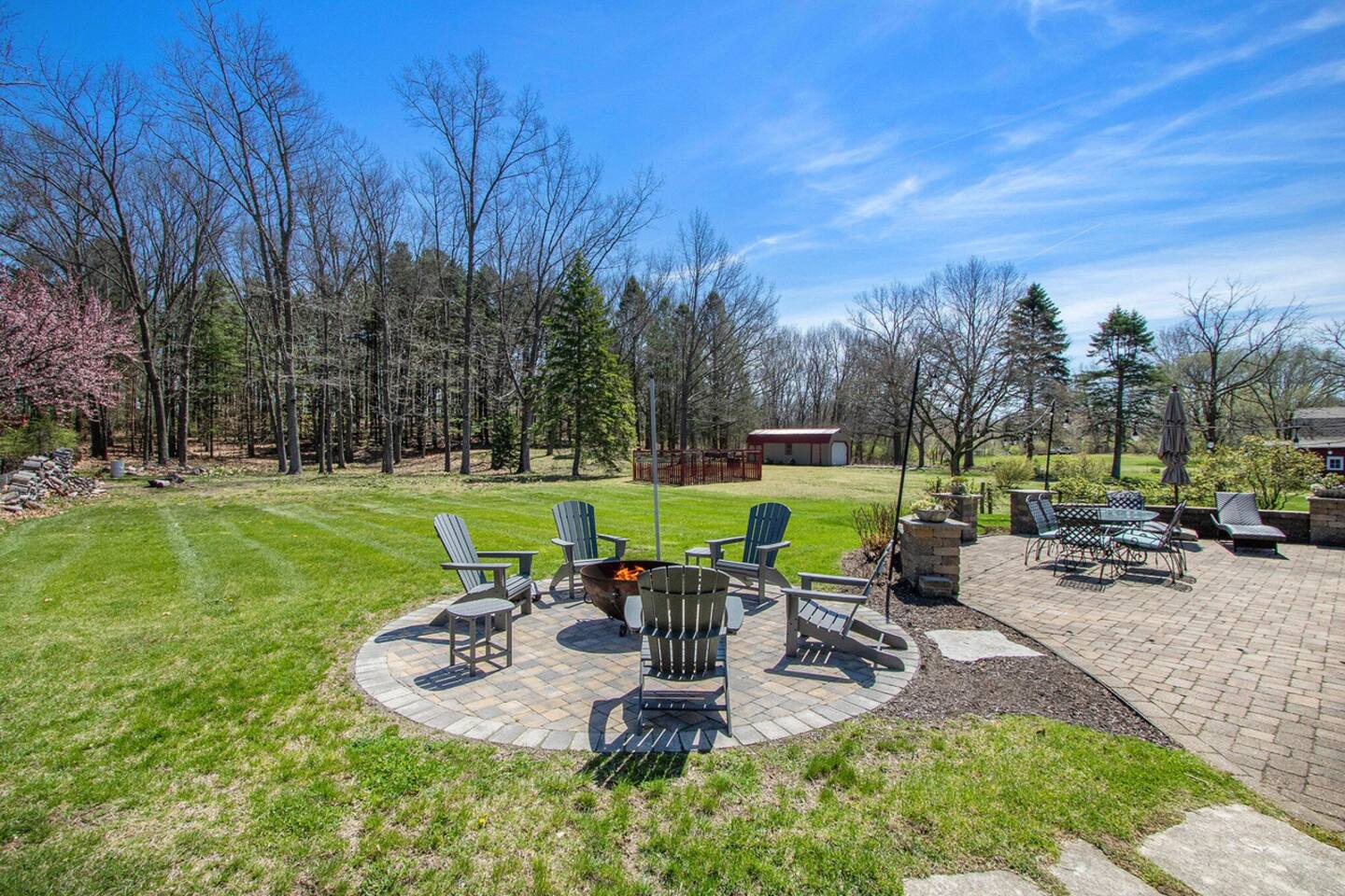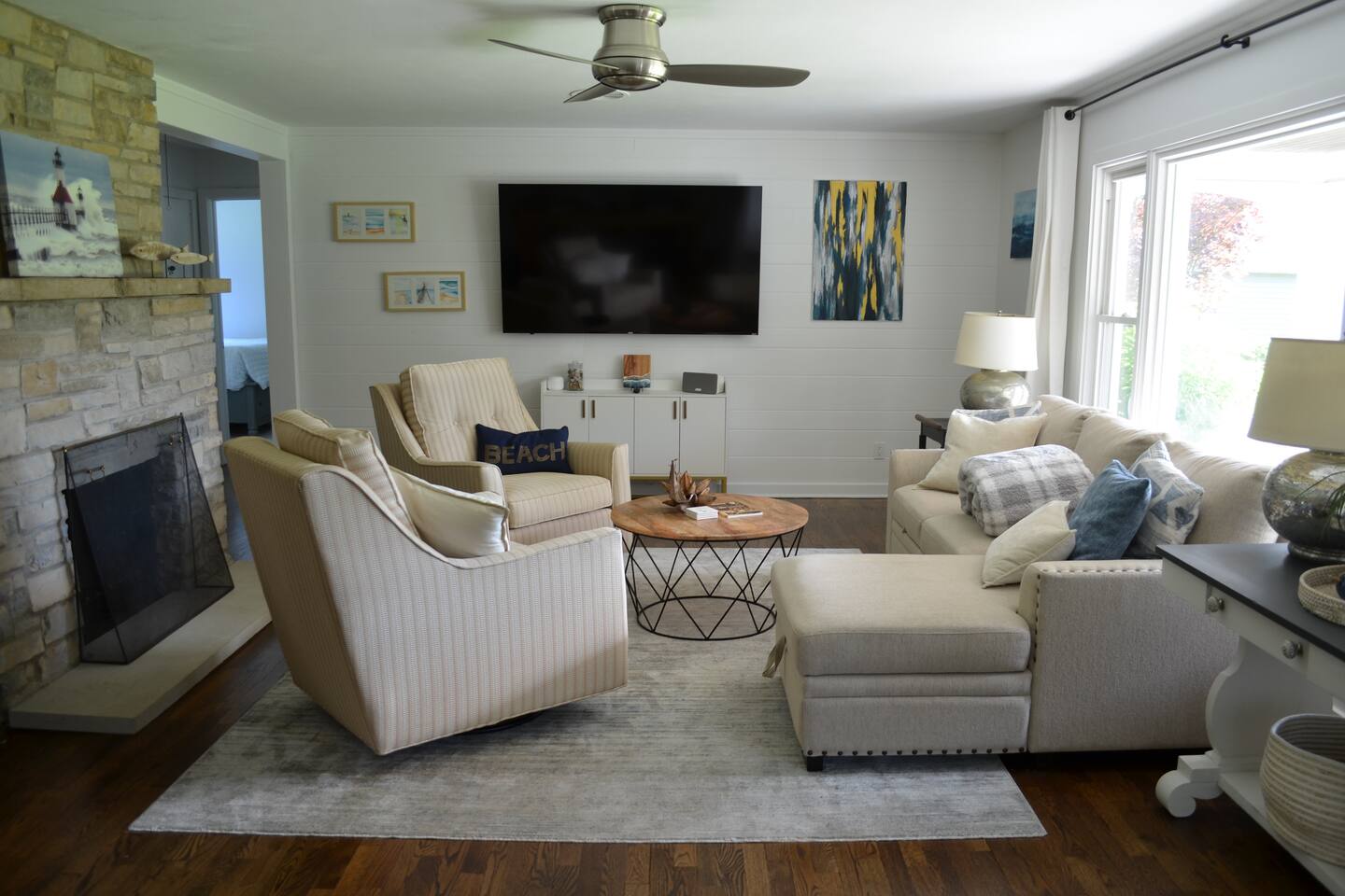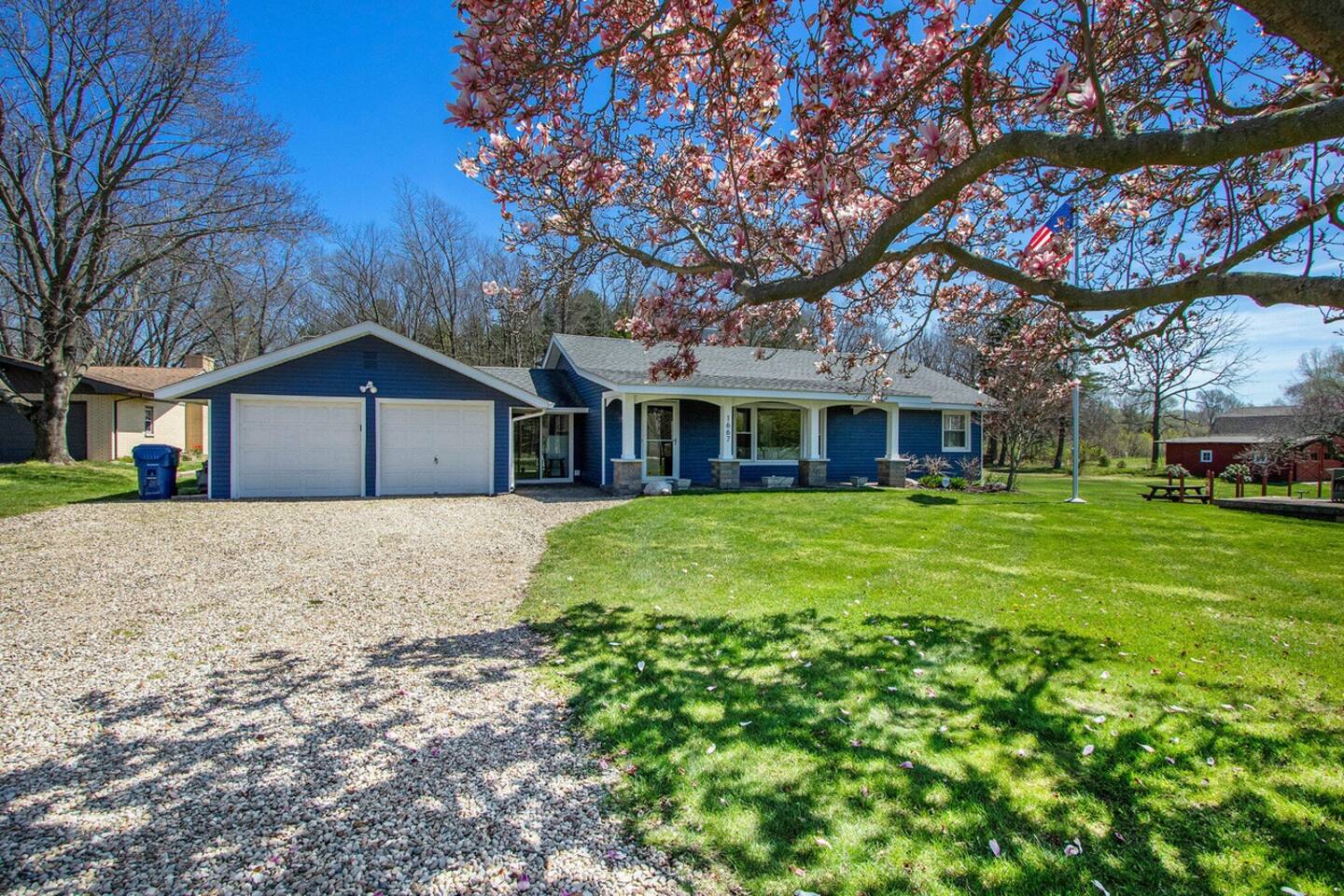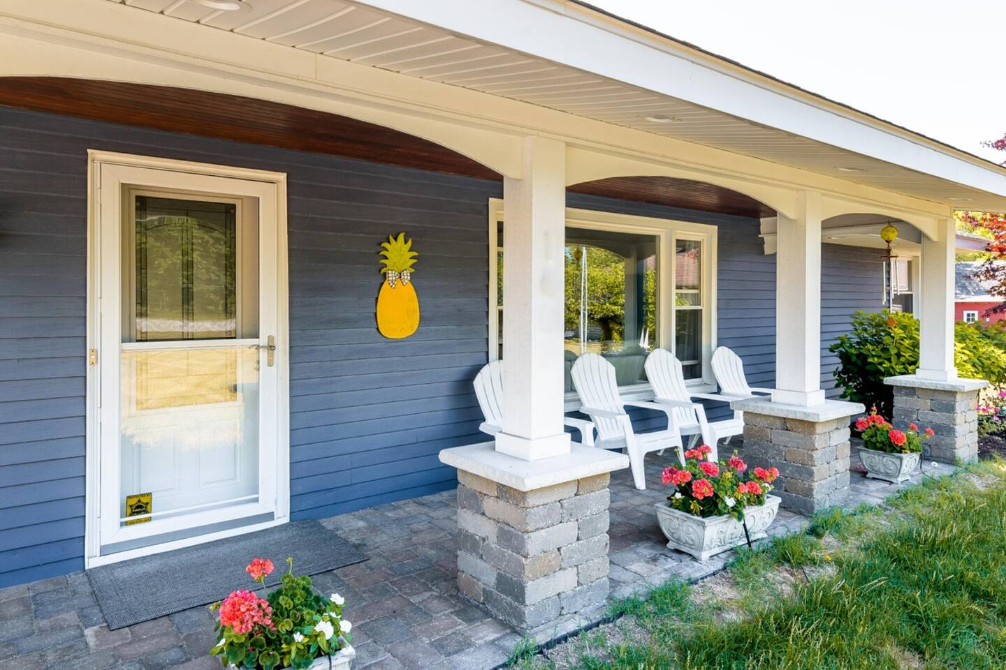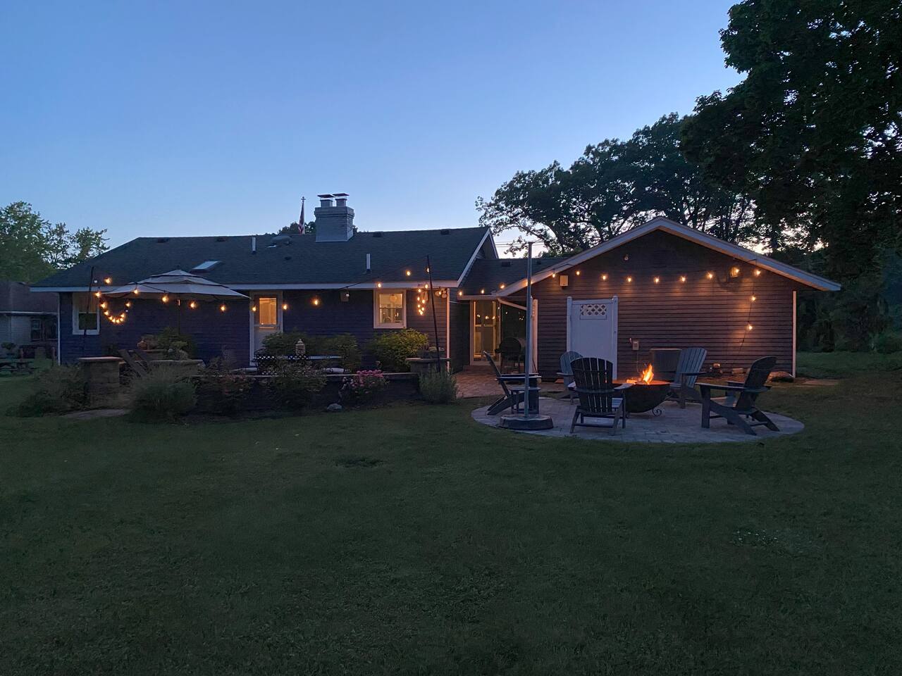 Make wonderful memories at Friday Fowls Cottage, a spotless and cozy cottage perfect for a family or group of friends. Located just minutes from Lake Michigan beaches, walking trails, bike paths, golf, and shopping, this amenity-packed home invites you to enjoy thoughtfully decorated rooms and gorgeous greenery outdoors. Highlights: 1 Min Drive to Rocky Gap Park and Beach 3 Min Drive to Jean Klock Park 5 Min Drive to Downtown St. Joseph (restaurants and shopping) 5 Min Drive to Wine Tasting Rooms 3 to 10 Min Drive to Several Golf Courses 20 Min Drive to Downtown South Haven BEDROOMS Hardwood floors are complemented by relaxing, neutral tones. The spacious master bedroom has a king bed, plenty of storage space, and a large TV. The second bedroom features a queen bed, closet space, and a smart TV as well. Both rooms are well-lit and equipped with premium linens, blankets, and pillows. Additionally the living room couch pulls out into a full size sleeper - see picture. BATHROOM The stylish bathroom features a skylight that allows plenty of natural light. Modern tiles and a spacious shower make for an enjoyable bathing experience. All the essentials are provided, including towels, shampoo, conditioner, body wash, and moisturizer. There is a full washer and dryer in the breezeway to take care of all your laundry needs during your stay. KITCHEN & LOUNGE On those nights you prefer to stay in, you can cook in the fully equipped kitchen which includes modern stainless steel appliances, a garbage disposal, and refrigerator with a filtered water dispenser. We provide all the essential cookware and silverware you need, as well as a whole-bean grinding coffee machine, a selection of premium teas, water kettle, toaster, and microwave. Enjoy a meal around the large 8-person dining table, or head outdoors to settle down and unwind on the backyard patio. A feature fireplace wall separates the kitchen from the living room. Kick back and relax on the comfortable sofa and chairs while enjoying your favorite entertainment on the 75” 4K TV. OUTSIDE SPACE Relax on the front porch with your morning coffee while you admire the flowers and greenery. You’ll have a huge private backyard area all to yourself, perfect for enjoying outdoor games and spending quality time with loved ones. The spacious patio has plenty of seating options for outdoor meals, which you can cook on the grill. Light up the fire pit as the sky darkens. Go and relax in the 4 person barrel sauna and a convenient outdoor shower is available for you after the schwitz or to rinse the sand off after a day at the beach. NEIGHBORHOOD There is plenty to do just minutes away from the cottage in our charming town. Enjoy the wine trail and beer tasting at the local micro-breweries, or go shopping for antiques downtown in St. Joe. If it’s the right season, a family outing to pick berries or peaches is a fantastic way to enjoy the sunshine. If that isn’t enough, you can enjoy the many beaches, bike paths, walking trails, and a game of golf nearby. If you forgot any beach essential, fear not. For your convenience, there are beach towels, folding chairs, and a cooler to take with you to the nearby beaches and parks. Book Now & Let Us Take Care Of You In Benton Harbor!