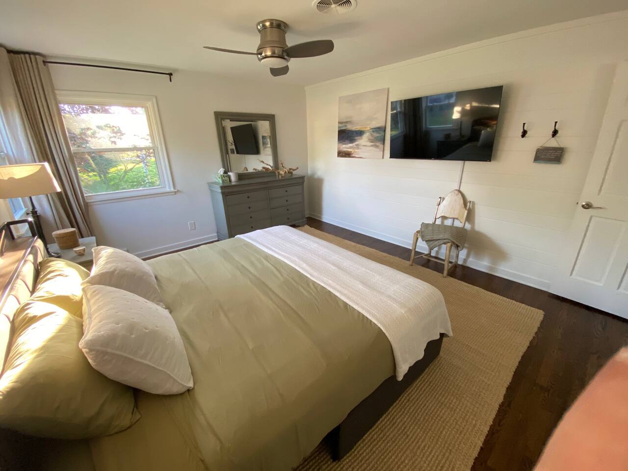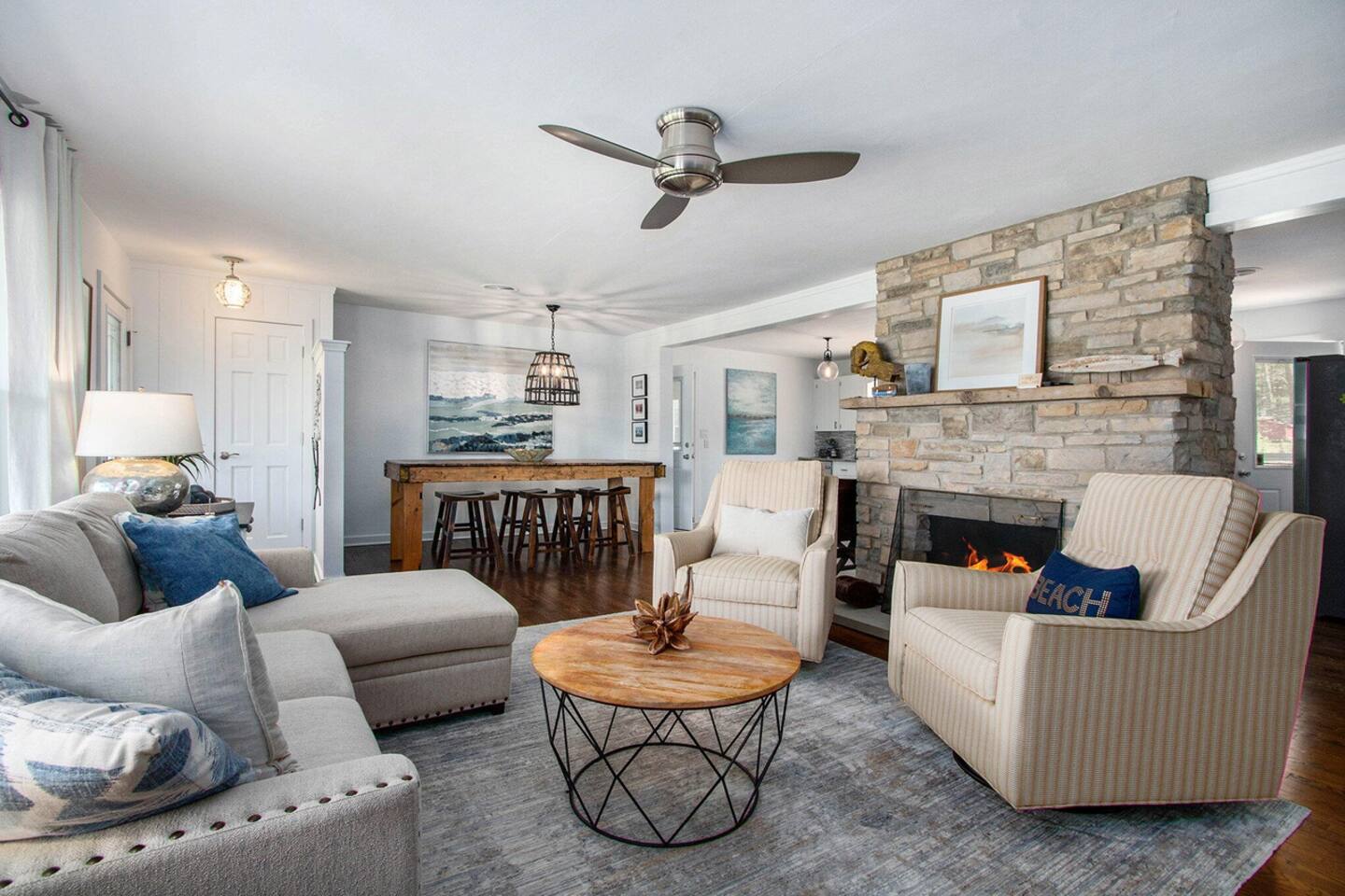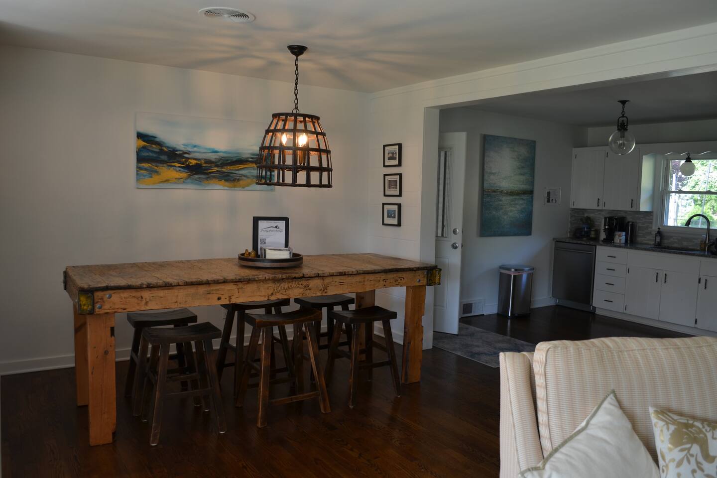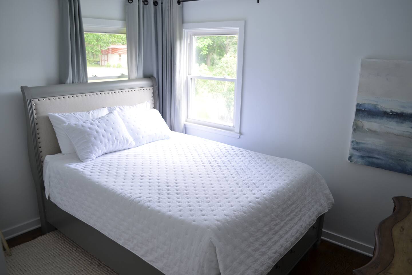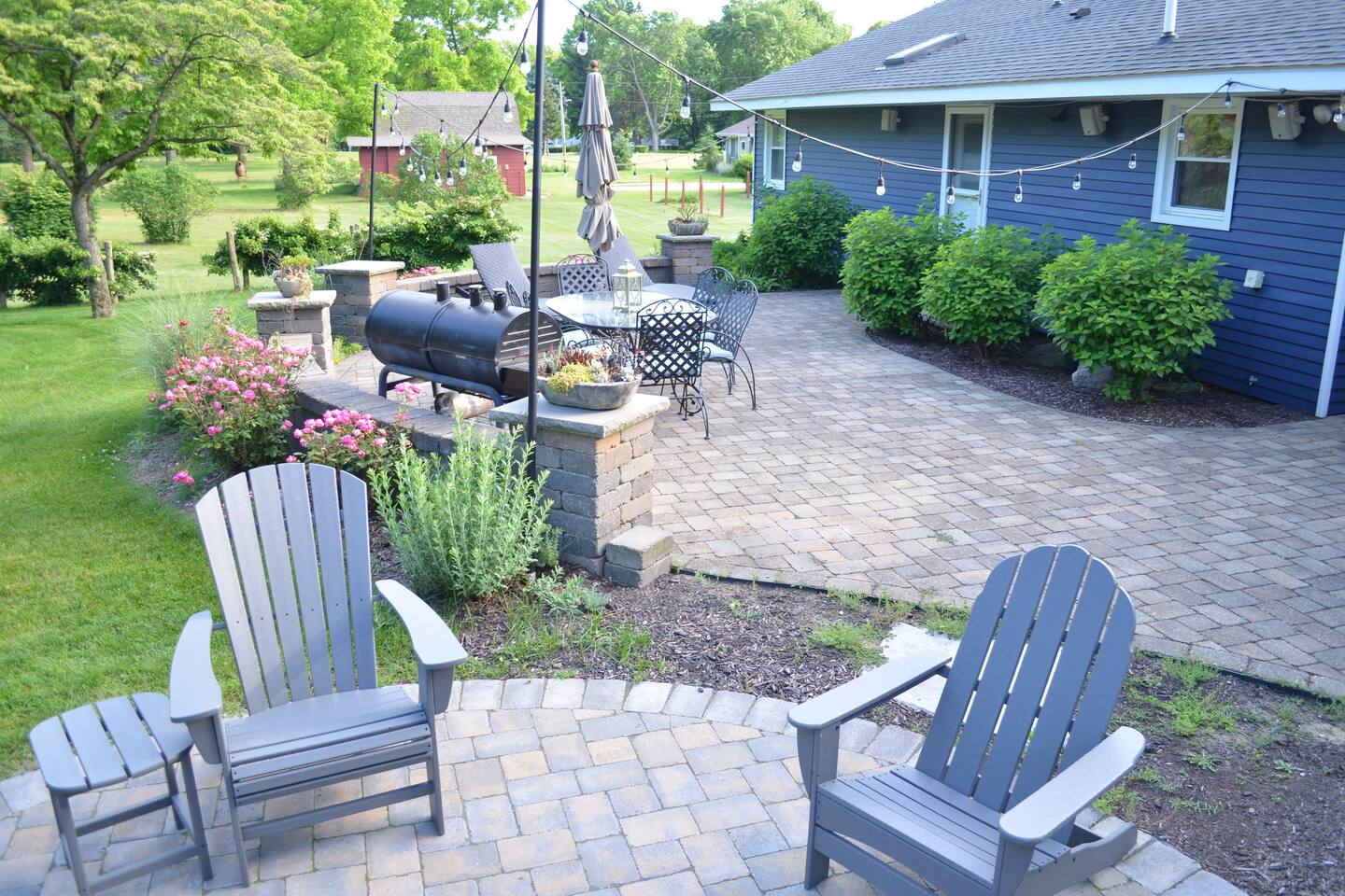Make wonderful memories at Friday Fowls Cottage, a spotless and cozy cottage perfect for a family or group of friends. Located just minutes from Lake Michigan beaches, walking trails, bike paths, golf, and shopping, this amenity-packed home invites you to enjoy thoughtfully decorated rooms and gorgeous greenery outdoors. Highlights: 1 Min Drive to Rocky Gap Park and Beach 3 Min Drive to Jean Klock Park 5 Min Drive to Downtown St. Joseph (restaurants and shopping) 5 Min Drive to Wine Tasting Rooms 3 to 10 Min Drive to Several Golf Courses 20 Min Drive to Downtown South Haven BEDROOMS Hardwood floors are complemented by relaxing, neutral tones. The spacious master bedroom has a king bed, plenty of storage space, and a large TV. The second bedroom features a queen bed, closet space, and a smart TV as well. Both rooms are well-lit and equipped with premium linens, blankets, and pillows. Additionally the living room couch pulls out into a full size sleeper - see picture. BATHROOM The stylish bathroom features a skylight that allows plenty of natural light. Modern tiles and a spacious shower make for an enjoyable bathing experience. All the essentials are provided, including towels, shampoo, conditioner, body wash, and moisturizer. There is a full washer and dryer in the breezeway to take care of all your laundry needs during your stay. KITCHEN & LOUNGE On those nights you prefer to stay in, you can cook in the fully equipped kitchen which includes modern stainless steel appliances, a garbage disposal, and refrigerator with a filtered water dispenser. We provide all the essential cookware and silverware you need, as well as a whole-bean grinding coffee machine, a selection of premium teas, water kettle, toaster, and microwave. Enjoy a meal around the large 8-person dining table, or head outdoors to settle down and unwind on the backyard patio. A feature fireplace wall separates the kitchen from the living room. Kick back and relax on the comfortable sofa and chairs while enjoying your favorite entertainment on the 75” 4K TV. OUTSIDE SPACE Relax on the front porch with your morning coffee while you admire the flowers and greenery. You’ll have a huge private backyard area all to yourself, perfect for enjoying outdoor games and spending quality time with loved ones. The spacious patio has plenty of seating options for outdoor meals, which you can cook on the grill. Light up the fire pit as the sky darkens. Go and relax in the 4 person barrel sauna and a convenient outdoor shower is available for you after the schwitz or to rinse the sand off after a day at the beach. NEIGHBORHOOD There is plenty to do just minutes away from the cottage in our charming town. Enjoy the wine trail and beer tasting at the local micro-breweries, or go shopping for antiques downtown in St. Joe. If it’s the right season, a family outing to pick berries or peaches is a fantastic way to enjoy the sunshine. If that isn’t enough, you can enjoy the many beaches, bike paths, walking trails, and a game of golf nearby. If you forgot any beach essential, fear not. For your convenience, there are beach towels, folding chairs, and a cooler to take with you to the nearby beaches and parks. Book Now & Let Us Take Care Of You In Benton Harbor!